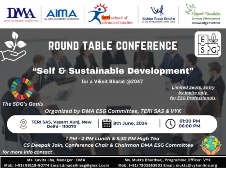 6th June 2024: The Delhi Management Association (DMA) ESG Committee, TERI School of Advanced Studies (TERI SAS), and Vishwa Yuvak Kendra (VYK) are pleased to announce a pivotal round table conference on “SELF & Sustainable Development,” scheduled to be held on 8th June., 2024 from 1:00 PM to 6:00 PM at TERI School of Advanced […]