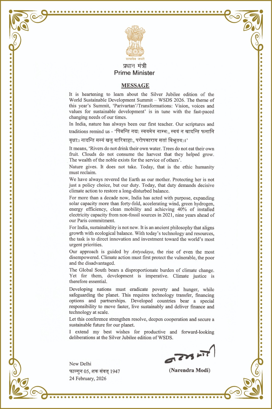 Before signing off, Dr Dhawan read out a Special Message shared by Shri Narendra Modi, the Hon’ble Prime Minister of India. One of the pertinent remarks that stood out, “Our approach is guided by Antyodaya, the rise of even the most disempowered. Climate action must first protect the vulnerable, the poor, and the disadvantaged. The Global South bears a disproportionate burden of climate change. Yet for them, development is imperative. Climate justice is therefore essential. Developing nations must eradicate poverty and hunger, while safeguarding the planet. This requires technology transfer, financing options and partnerships. Developed countries bear a special responsibility to move faster, live sustainably, and deliver finance and technology at scale. Let this conference strengthen resolve, deepen cooperation and secure a sustainable future for our planet. I extend my best wishes for productive and forward-looking deliberations at the Silver Jubilee edition of WSDS.”